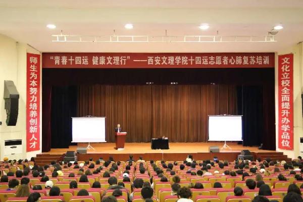 4月14日下午,西安市卫健委、市中心医院在我校大礼堂举办“青春十四运 健康文理行”——米兰官方注册_米兰(中国)十四运志愿者心肺复苏培训活动。市卫健委科教处程婕处长,市中心医院虎威院长、郭华副院长、中心医院神经内科护士长周彦芝团队,校团委副书记武文斌及学校十四运志愿者、第十四期青马班学员共计600余人参加了培训活动。